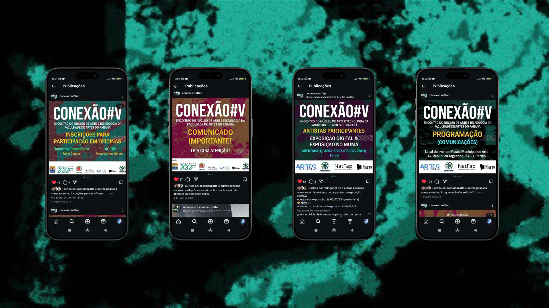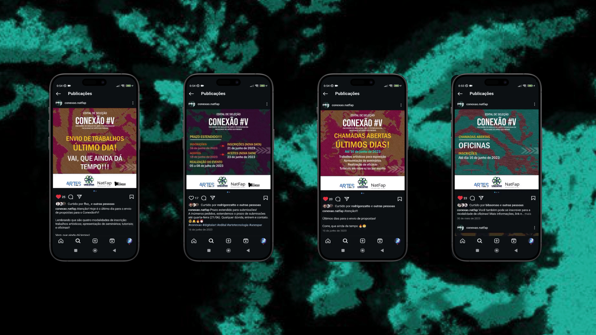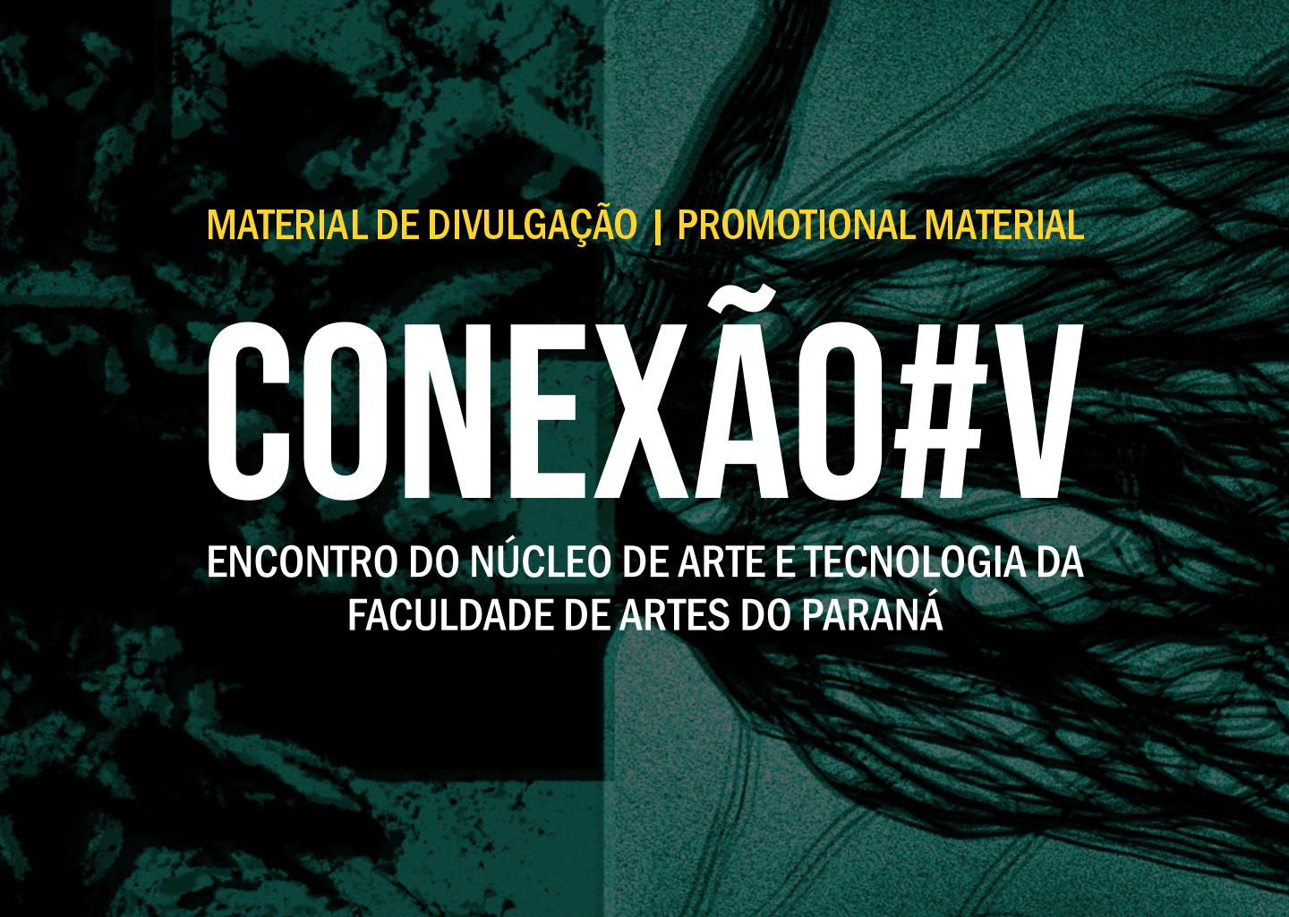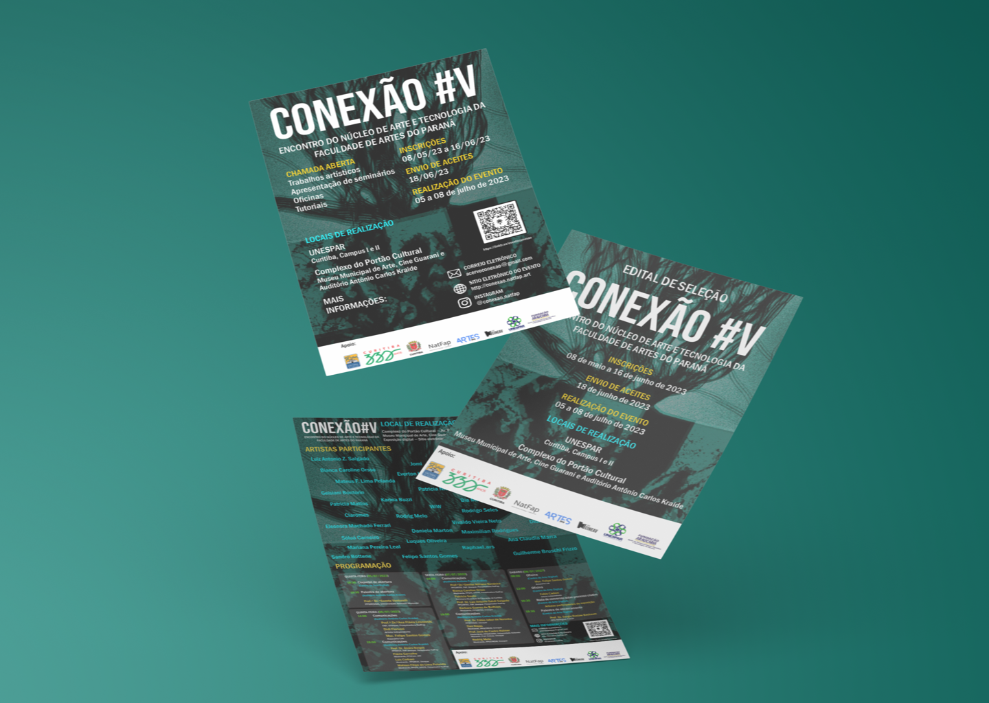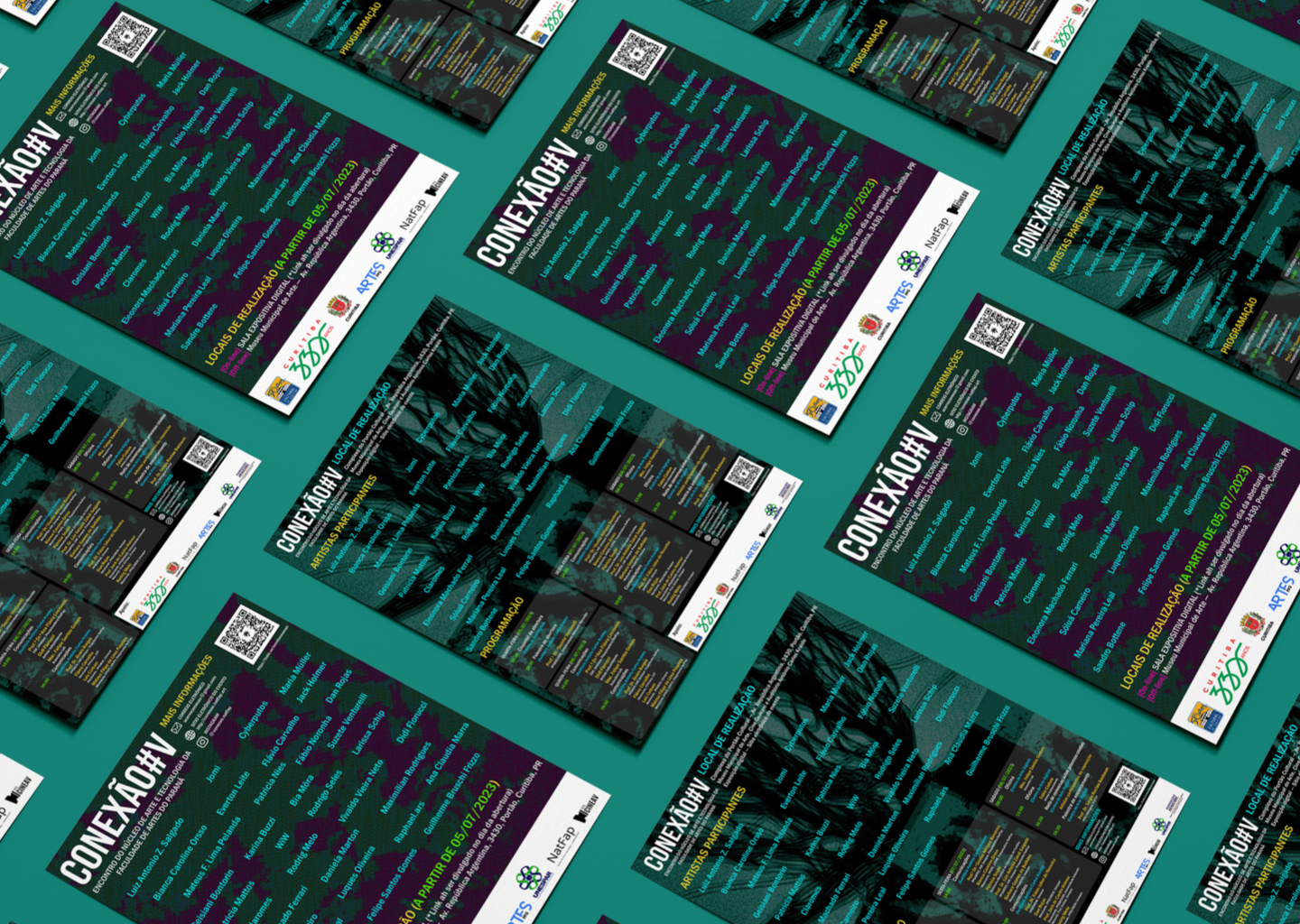Conexão#V was the fifth edition of an Art, Science and Technology event promoted by the Art and Technology Center of the Faculty of Arts of Paraná. This edition of the event took place during July 2023. In addition to being a co-organizer and having co-developed the event’s visual identity with Bianca C. Orsso and Luiz Antônio Z. Salgado, I also worked as a designer for the production of the event’s promotional material.