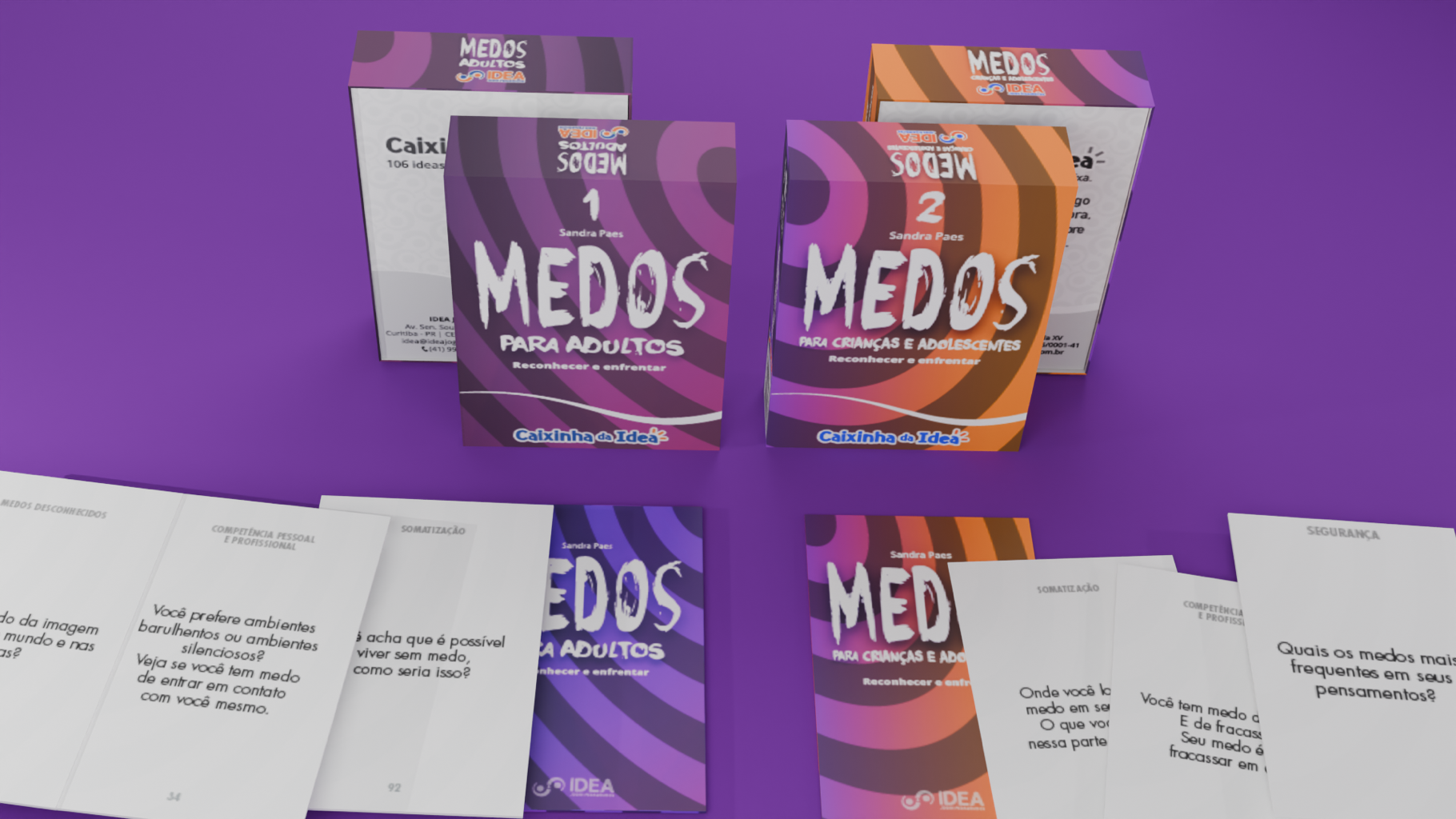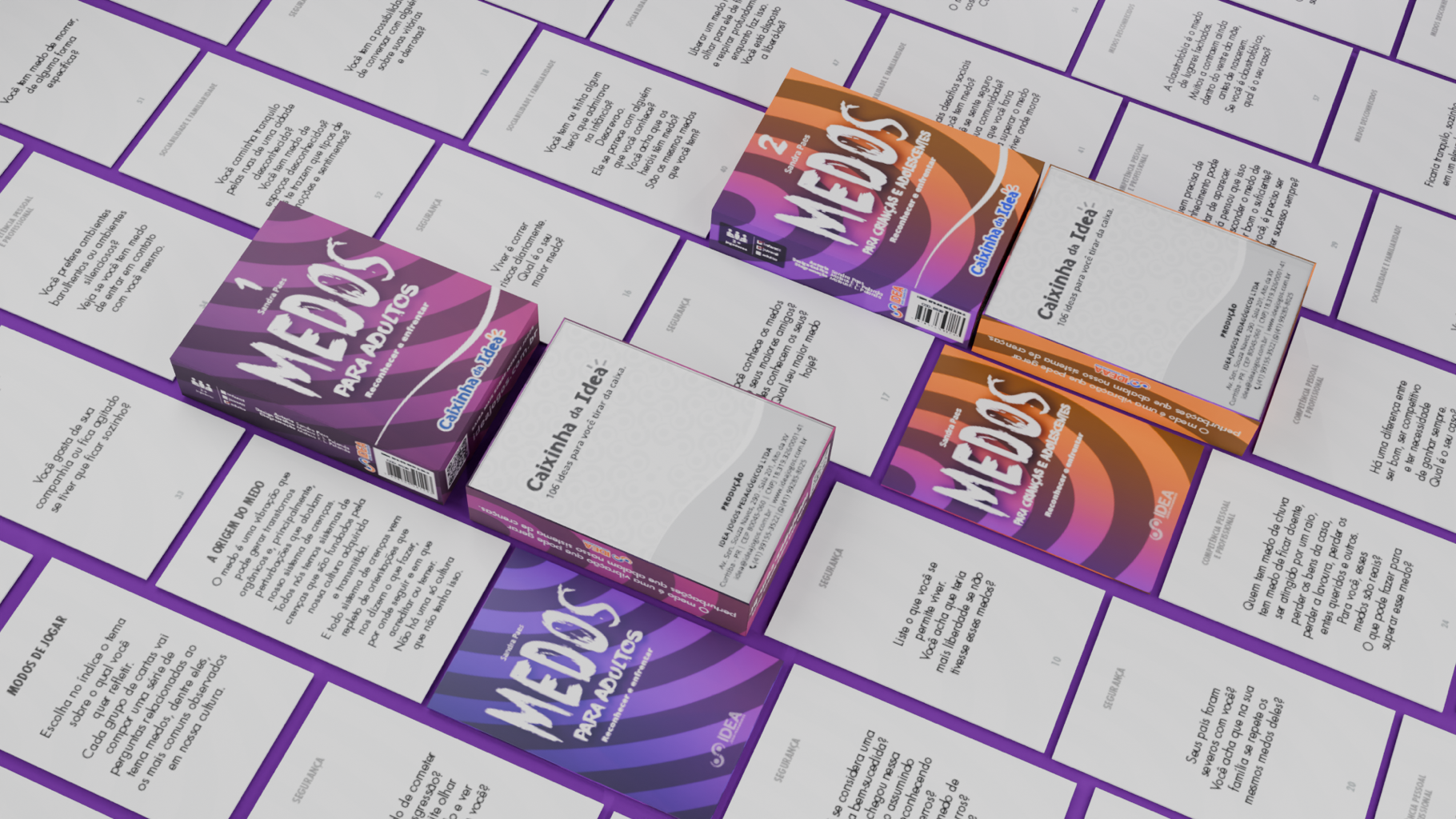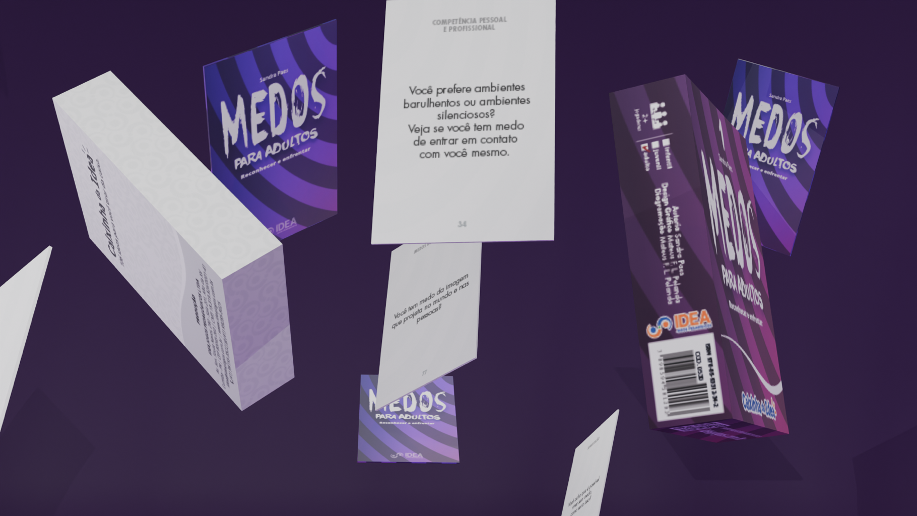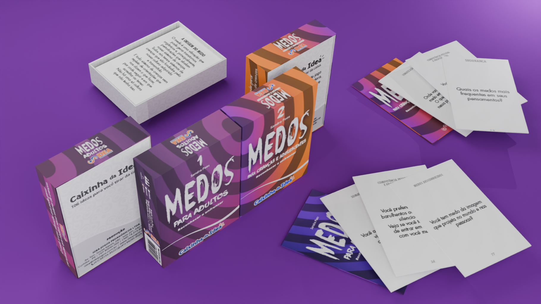 “Medos, Reconhecer e enfrentar” [Recognizing and Facing Fears], (1) For Adults and (2) For Children and Adolescents, consists in two decks (educational games) designed by Sandra Paes to playfully work on identifying fears. The decks were developed by Idea Jogos Pedagógicos. Here I worked as a graphic designer (cover and cards) and layout artist to create the cardboard game.